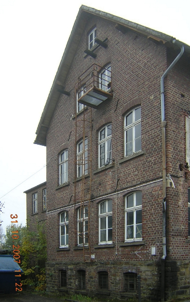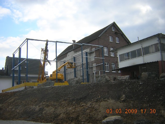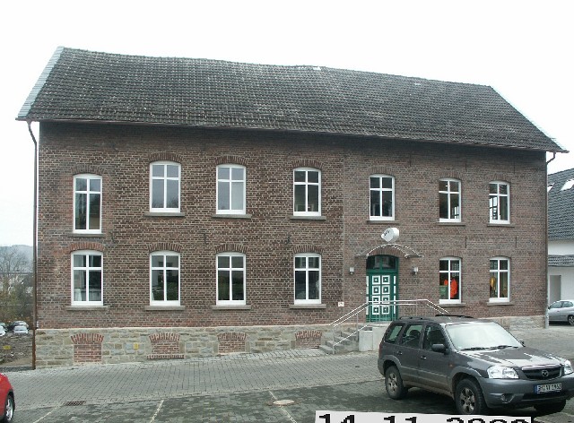 Sanierte Westansicht + neue Halle + historischer Pausenglocke |
