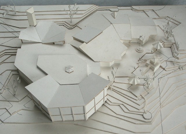 Wettbewerbs-Modell mit Erweiterung des Gemeinde-saales, links, und
