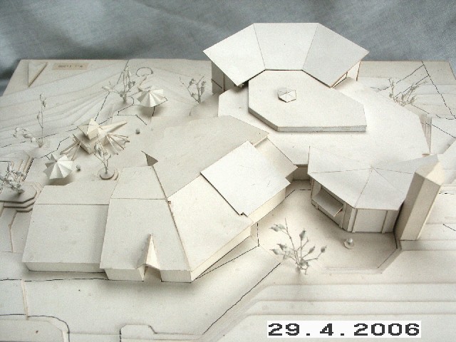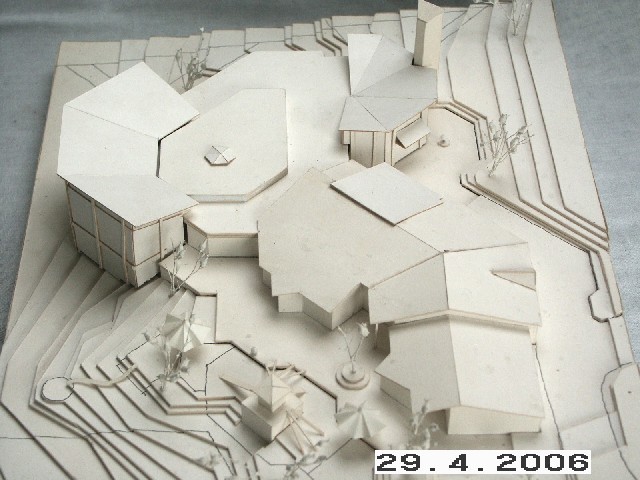 Wettbewerbs-Modell mit Erweiterung des Gemeindesaales, rechts, und